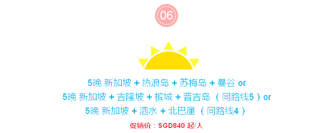 星期日:新加坡 离港 6PM星期一:热浪岛 抵达 11AM / 热浪岛 离港 8PM星期二:苏梅岛 抵达 11AM / 苏梅岛 离港 8PM