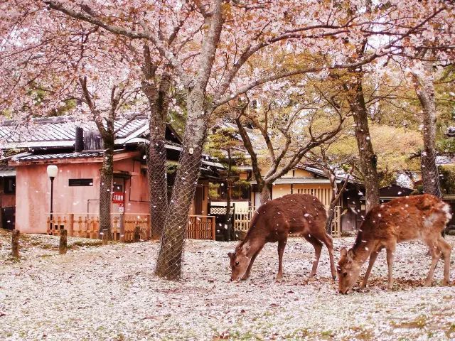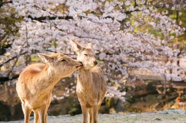 ||奈良公园因其到处自由奔跑的鹿而出名,竟有约1200头之多。660公顷的广阔土地面积上,种植有以八重樱为主的多种樱花树。在樱花树下取景时,总有调皮的小鹿充进你的镜头,无论什么造型,都给你画出一笔独一无二的活力春色。