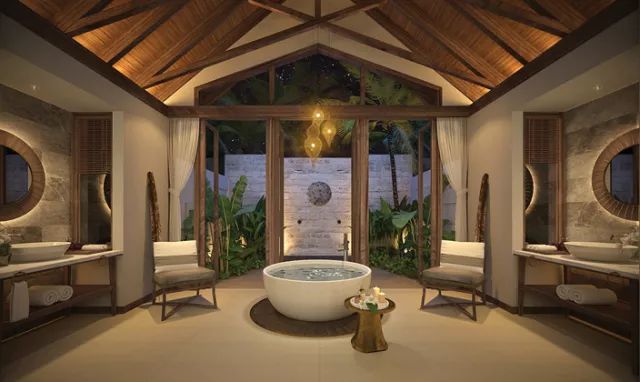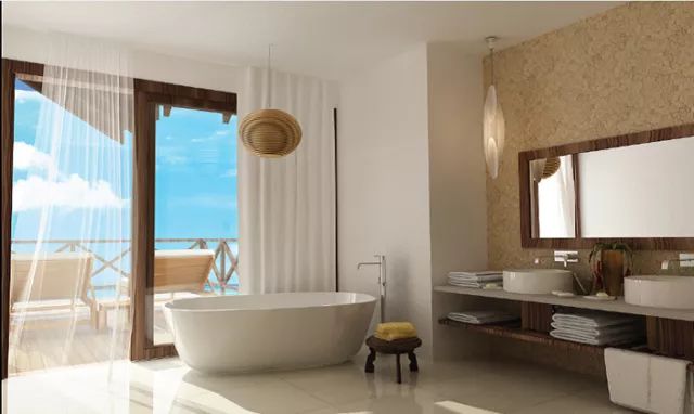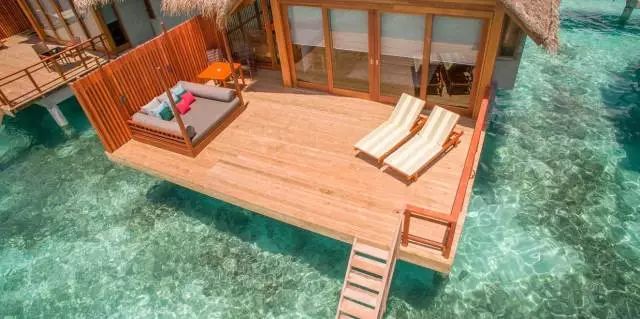海上别墅建立在绿松石泻湖上,由木质浮桥连接着岛屿,好像漂浮在绿色的泻湖上面,别墅采用日光躺椅和户外用餐区来扩展双层阳台来打破纯粹的隐私,客人将在豪华别墅中感受岛着淡淡的海风吹拂和远处的地平线景观并可以通过别墅的木楼梯扶手直接通往诱人的泻湖。