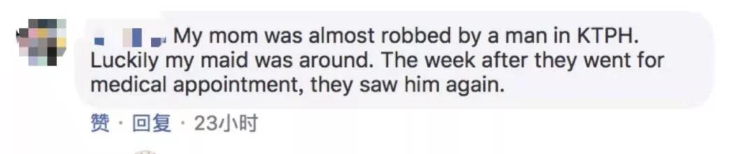 “我妈妈在邱德拔医院差点被一个人抢了 !幸亏当时女佣在旁边。一周后再去医院问诊的时候, 又看到了那个男的。”
