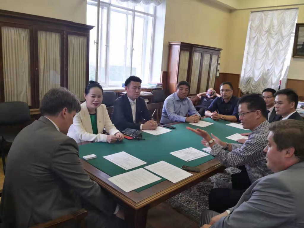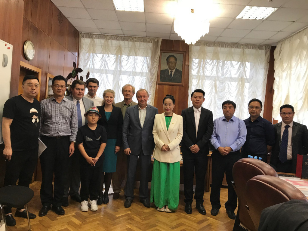 在俄罗斯科学院,生化物理系院长Kurochkin 教授和前任院长已在门口恭候代表团的莅临,他们热情地引导大家至会议室就坐,双方互致问候。Kurochkin 教授热情的用投影仪向代表团演示介绍了他们生化物理性的八大发展方向和理念,代表团成员屏息凝神认真聆听,为对方的尖端研发和广泛的市场应用所折服。之后,Kurochkin 教授示意他的两位博士生拿出了几款已申请了专利的研发产品给代表团演示,包括其中一款能够让塑料快速、低价、无害分解的环保技术产品,另人赞叹。留意到团员们广泛的行业背景,Kurochkin 教授希望代表团可以考虑投资于这些研发成果、使之商业化,他并期望代表团能够将消息带回给中新两国各界人士。孙侠会长高度肯定了这些研发成果,并表示会认真考虑教授的提议。双方最后互换了资料以备进一步的跟进。