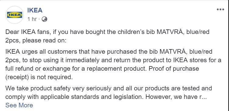 已购买该产品的顾客可随时到IKEA店面获得全额退款(不需收据),或换购同款产品,其他颜色的MATVRA产品并未受影响。