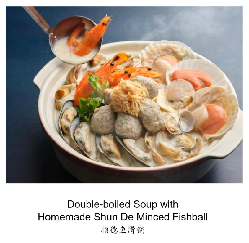 Famed for his hearty Cantonese-styled soups, Executive Chef Leung Wing Chung will be presenting a single-serve order of luxurious double-boiled soup, teeming with various seafood items such as Shunde fishballs, mussels and prawns, as part of a seafood buffet feast. Upon lapping up the ingredients, diners have the option to top up $10 for a portion of Crispy Rice (脆米) to add a little crunch to the flavourful broth.