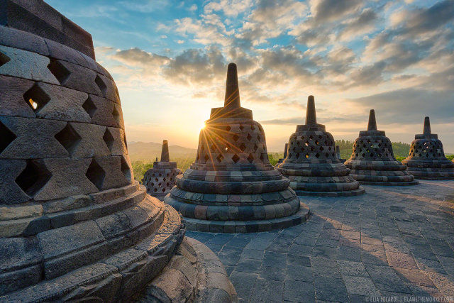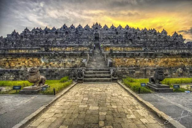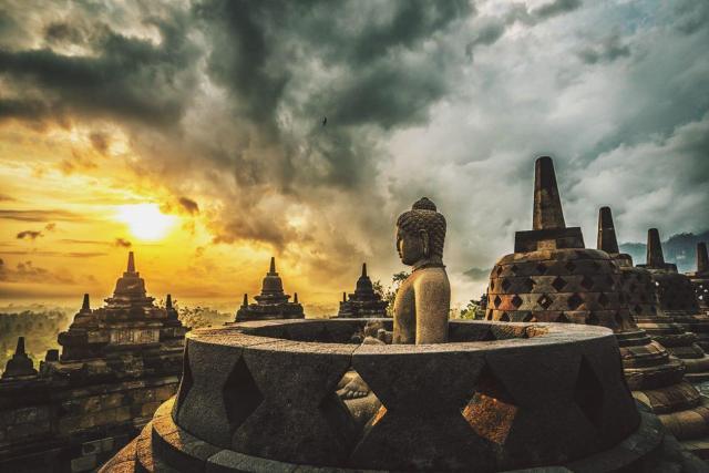 日惹以北,沐浴在婆罗浮屠的晨光;这处隐匿在茂密丛林近千年的佛塔建筑群,与中国长城、印度泰姬陵、柬埔寨吴哥窟并称为“古代东方四大奇迹”;向东南方向驶达普兰巴南,印尼最宏伟的印度教寺庙群遗址;