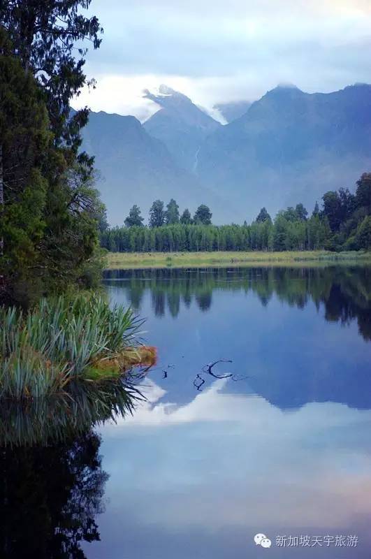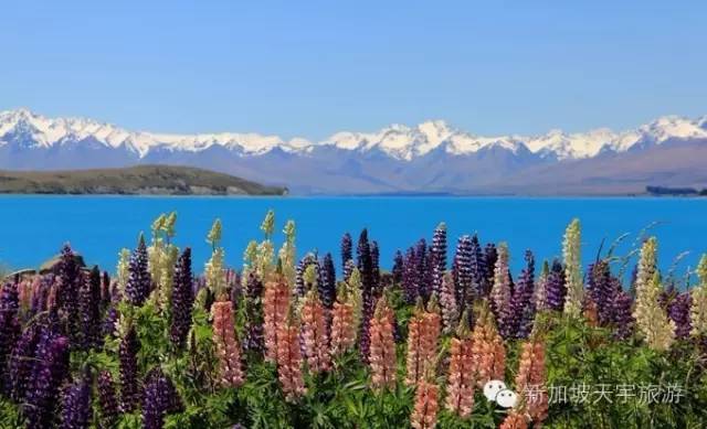 || 白雪皑皑的南阿尔卑斯山,湖边长满了色彩绚丽的鲁冰花,点缀着雪山湖景
