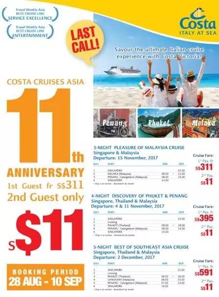 歌诗达邮轮:第二位只要S$11元! 双重好礼太疯狂!