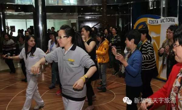||11:00,11层甲板泳池边,舞蹈恰恰恰的课程又开始了!这是我很喜欢的一种舞,怎么能落下?我发现喜欢舞蹈的人群总是那一伙人,刚刚10点从五层学习舞蹈的,几乎都像铁粉一样紧追不舍的跟着娱乐团队追到了11层,哈哈!在今后的几天里,大家也是如此铁粉呢!即便是在这样三十几度的高温下,也是热情不减!