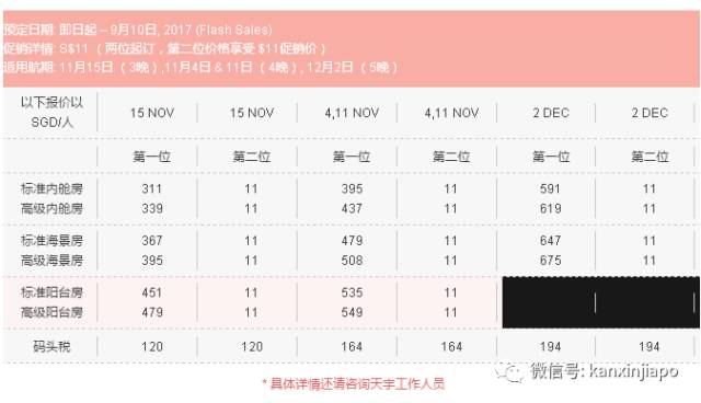 以下促销价不含 码头税:S$194/人 小费:成人 USD67.5/人 儿童 USD33.75/人 (3岁以下不用付)促销1:4人同行两人一房内舱房:S$320/人 起海景房:S$360/人 起