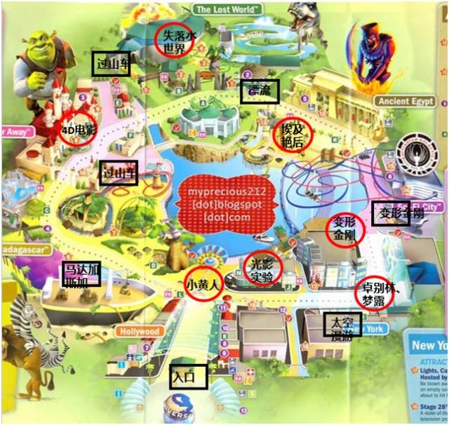 上面地图为适合亲子游玩的区域:方形为游乐设施区域,圆形为与角色见面及表演区域项目。主要人物合影推荐:小黄人、卓别林、梦露、埃及艳后。主要纪念品推荐:小黄人/变形金刚的水壶、书包;马达加斯加的动物玩偶等。