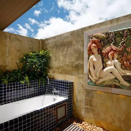 >> 还有这露天的浴缸,这后现代壁画…