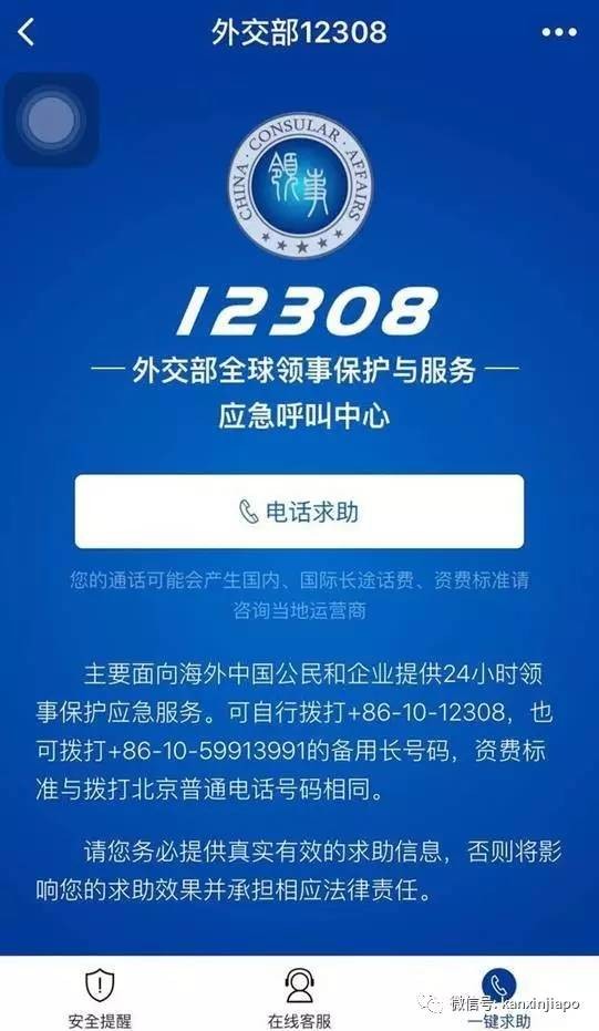 2. 中国公民在海外遇到紧急情况,也可通过关注微信公众账号“领事直通车”或小程序“外交部12308”,在微信平台进行实时咨询和求助。