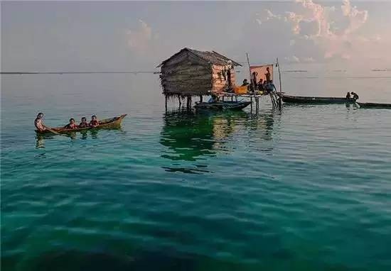下图中船上的男人有二位妻子,他们一家七口人就生活在身后的小屋中