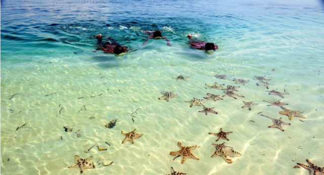 整个小岛就位于一片巨大的天然珊瑚群之上,洁白的沙滩环绕着这个小岛,五颜六色的鱼和海星,还有黑色的海胆,眼睛发出蓝色诡异的光。