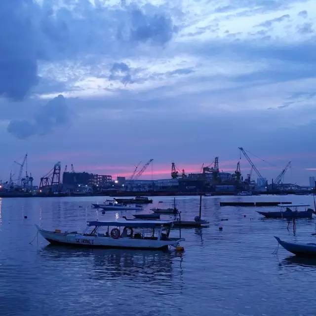 到了傍晚,海面上工业建筑发出的点点光火,让原本平淡静谧的大海,多了些许神秘,又是另样日落美景。