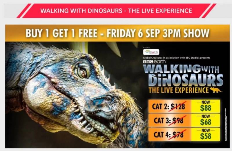 毫不夸装的说,两千万大制作成本的【Walking with Dinosaurs】算得上全世界迄今为止最大的、最棒的恐龙秀,还没有去看的小伙伴要抓紧最后这一周啦,闭幕周所有门票都有折扣,而且本周五下午3pm的场次主办方放出了“买一赠一”的特惠(以原价为基础)。整场表演1小时40分钟,中间有20分钟休息时间。