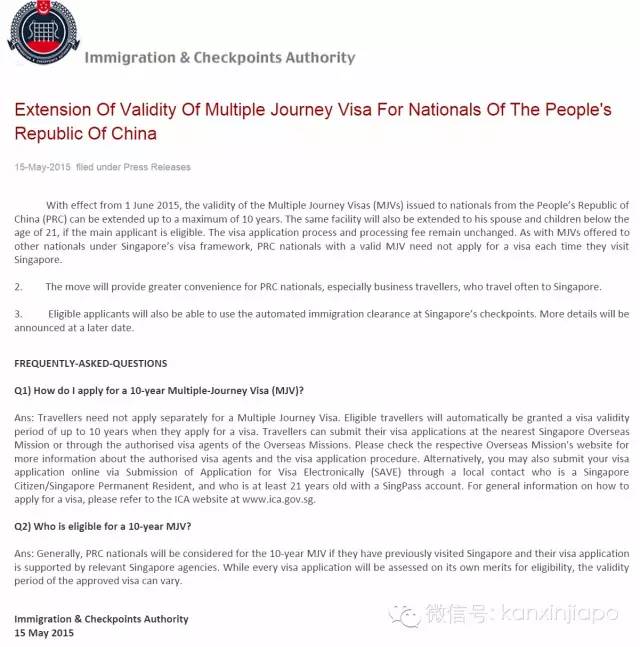喜大普奔!新加坡移民关卡局今日宣布将为中国公民开放新的签证举措,自2015年6月1日起,新加坡移民关卡局颁发给中国公民的新加坡多次有效签证(MJV)将最长可达10年有效期,以方便中国旅客到访新加坡。若主申请人获得此项资格,其配偶、年龄未满21岁的子女将获得同样的有效期限!