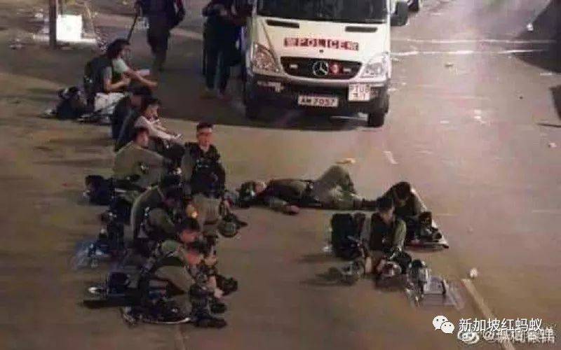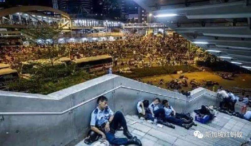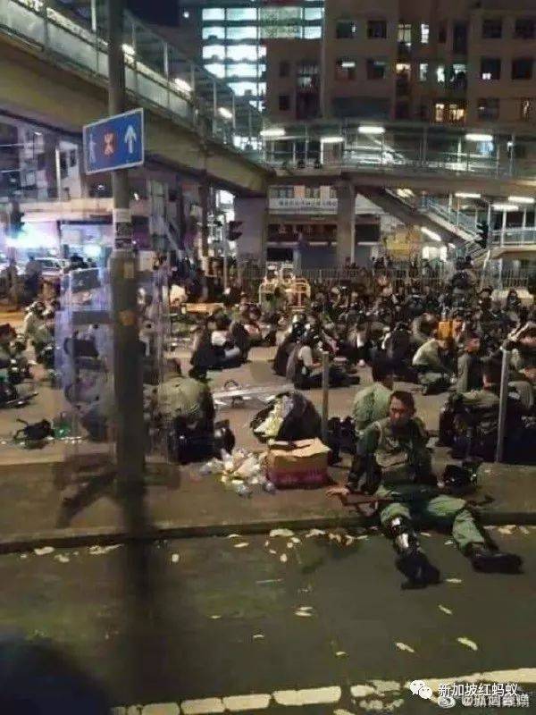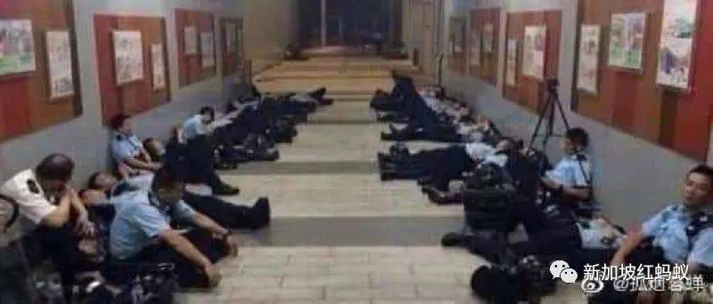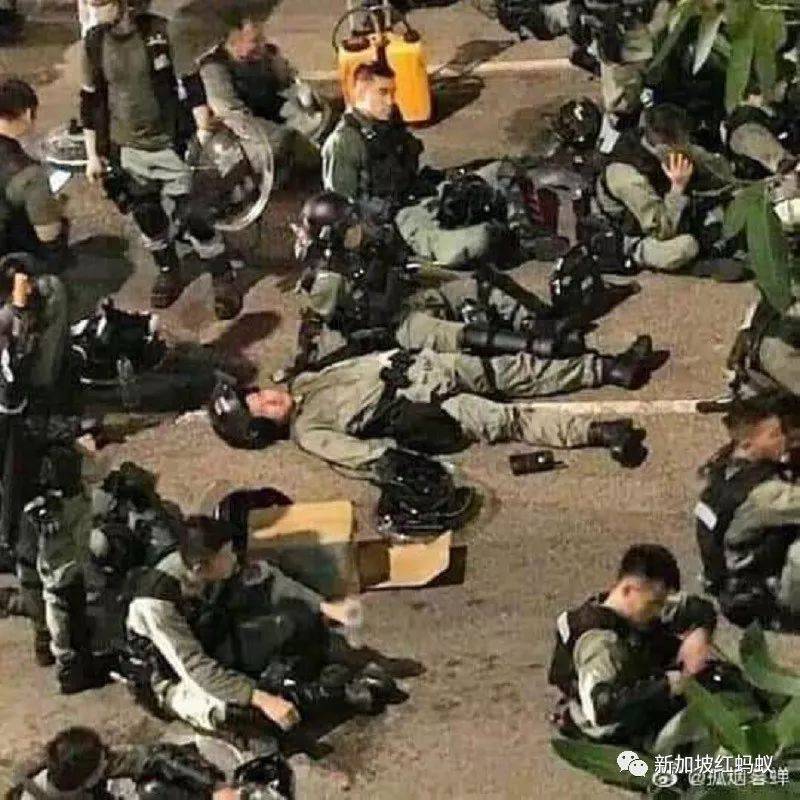然后附上了六张像素模糊的照片,但还是能看到大批大批在反送中抗议中维持秩序的香港警察累垮的一幕幕。