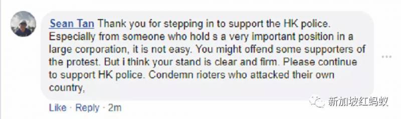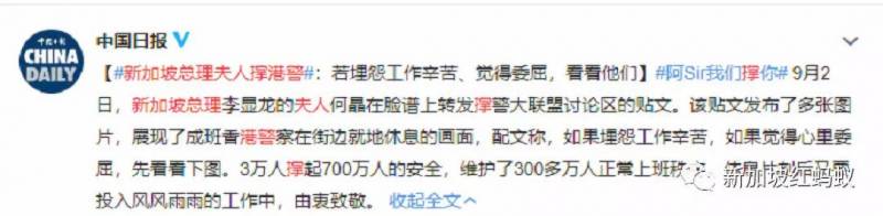 “像夫人这些执掌大机构(新加坡淡马锡控股)的女强人,站出来支持香港警察很不容易,因为这样可能会得罪那些支持反送中抗议者。但我认为你的立场是明确和坚定的。”
