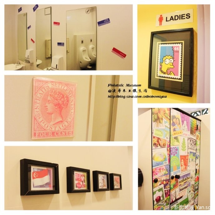 这是非常特别的卫生间吧,女卫生间是一个邮票的图案,镜子旁边都是各种信件邮寄方式的标识,连门也布满贴纸