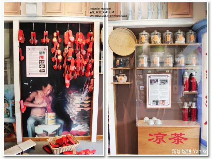 除了集邮文化,这里还有一些旧时新加坡生活的展示,左边的红色拖鞋,你一定不知道是做什么的,至少我是看了电影才知道的,也许我们国内南方地区也有这个习俗,惊蛰那天,或者平时遇事不顺,新加坡人喜欢用红色的木头拖鞋来打小人,把纸剪成人形,然后用红拖鞋一边拍一边说“打你个小人头,打你个小人身”后面一堆福建话,听不懂,很有意思。