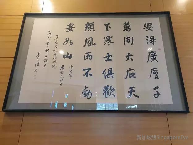 新加坡已故文化泰斗潘受先生于三十多年前按唐代诗圣杜甫《茅屋为秋风所破歌》之著名诗句所题写的巨幅书法作品。此一装裱作品长期悬挂在岛国大巴窑市镇地标性的建屋发展局综合大厦(HDB Hub)内的一楼大厅墙上,惟四周急于办事的过路人行色匆匆,甚少抬头留意和欣赏。(图片来源:笔者自摄。)