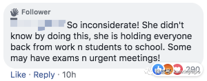许多网友纷纷在Facebook上留言,很多人批评大妈太不理智,不仅危险,还连累其他要上班上学的人。