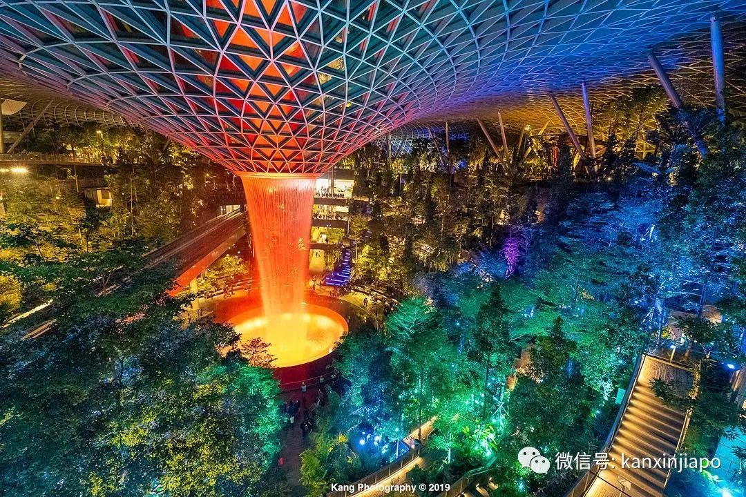 说起“火”,便会想到光。每天夜幕降临,优美音乐响起,星耀樟宜会上演垂直水幕灯光秀,红橙黄绿的绚丽灯光打在瀑布上,水跟着音乐起舞,美不胜收。