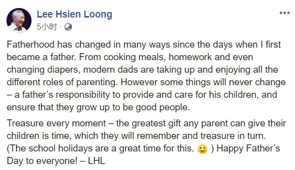 今天(6月16日)是一年一度的父亲节,新加坡总理李显龙和其他各部长也都送上了节日的祝福与问候。