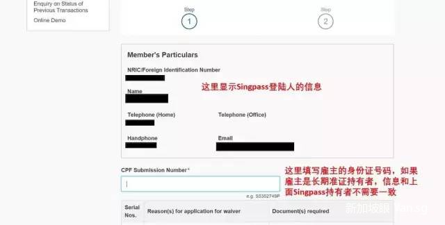 系统默认显示Singpass登陆人的信息,雇主可以填写自己的身份证号码在蓝色框里。