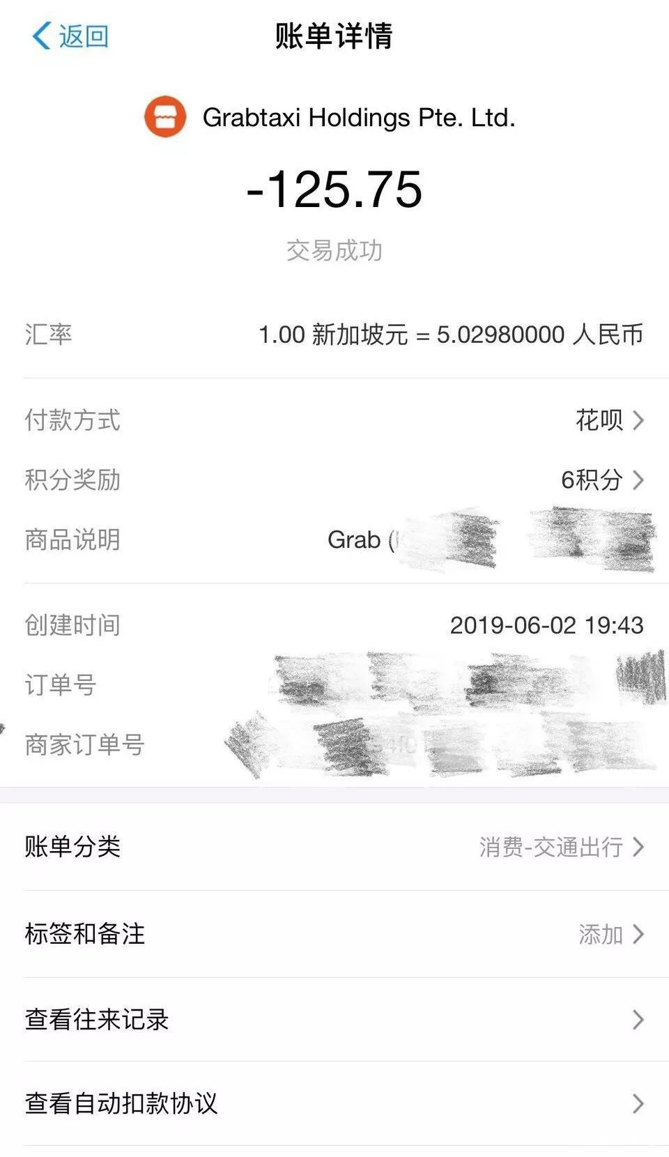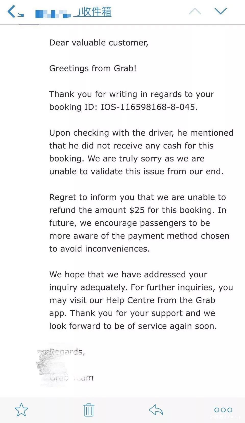 网友立即向Grab投诉,得到的答复是司机否认收取现金,而Grab本身不是无法确认信息,所以无法取消支付宝付款。