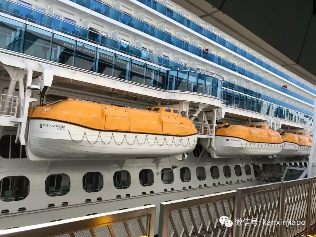 过了安检,就可以顺利登船了。附在邮轮上的这些小黄船,都是救生用的~