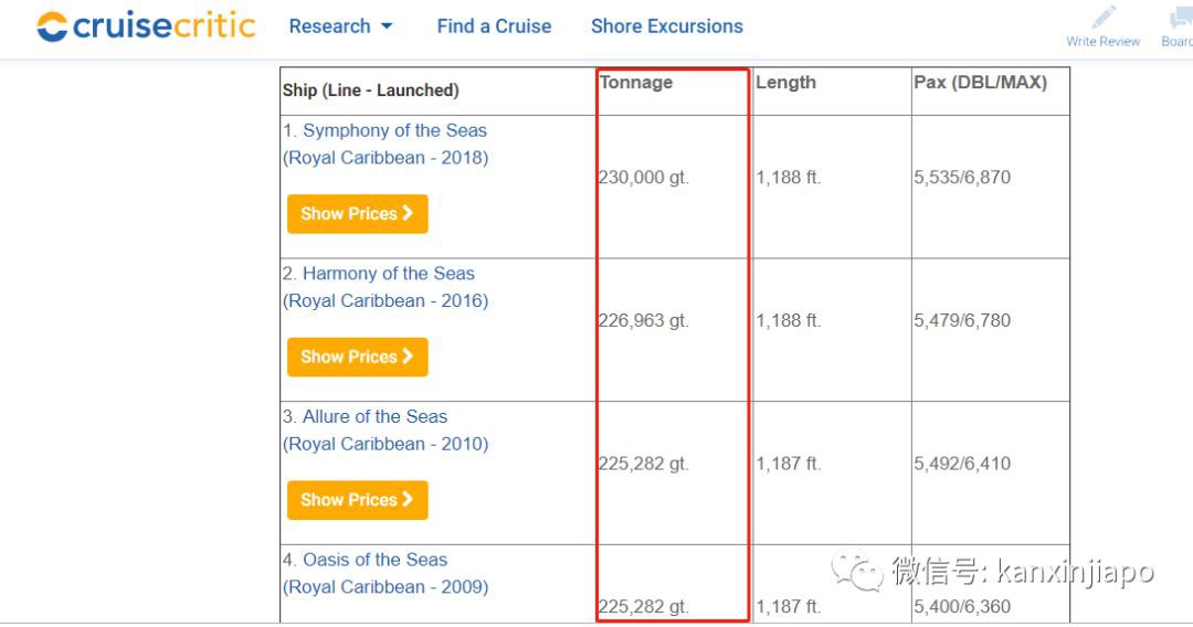 ▲(来自Cruise Critic网站的数据,2019年邮轮吨位排名)