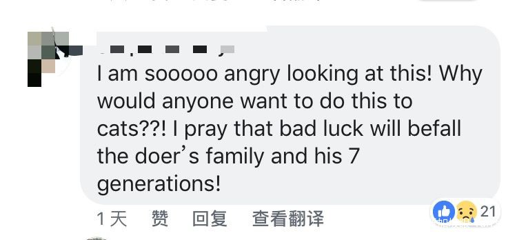 “看到这个我真的超级超级生气,为什么会有人会这样对待猫咪?!我诅咒那个人倒八辈子霉!”