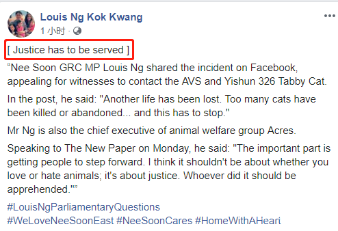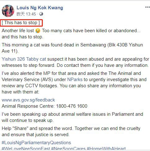 事件引发的不仅是网友的公愤,连新加坡议员黄国光都在关注此事。他专门在脸书上发帖,还用了“这些行为(虐猫)必须停止”的标题。