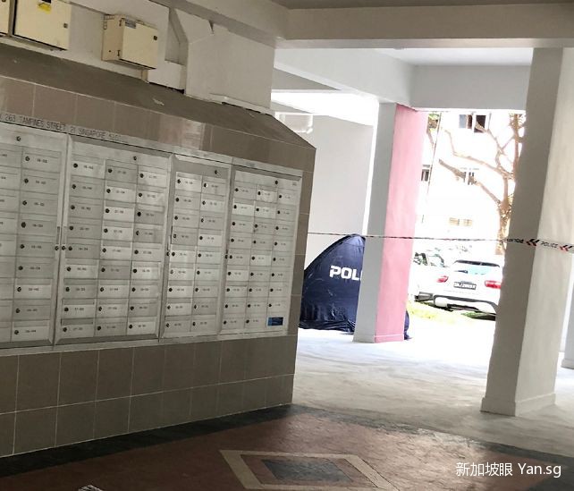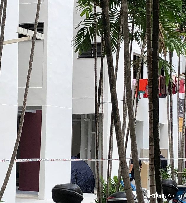 警察在事发组屋楼下围成一圈。自杀现场周围拉起了警戒带,还搭起了蓝色帐篷……(人没了……)