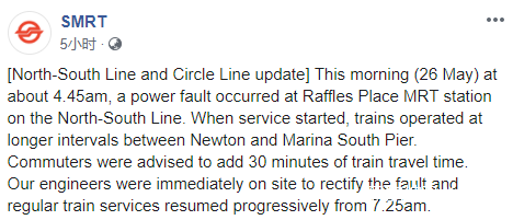 早上凌晨4点45分左右,他们发现莱佛士地铁站发生了电力故障,从而影响了列车的运行。当时,纽顿站和滨海南码头站之间的红线列车都运行缓慢,不过他们的工程师正在维修中。