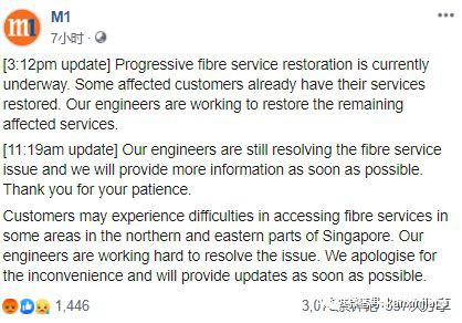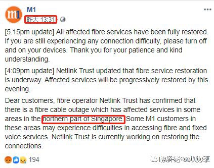 话说,其实M1的网络在昨天就出问题了……只不过当时受影响的只有新加坡“北部”的民众而已,下午5点多钟就修好了。