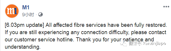 在公告中,M1称他们的工作人员目前正在抢修光纤线路。不过在这段期间,新加坡北部和东部地区的小伙伴估计无法使用光纤服务了。
