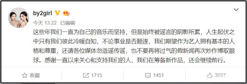 就在何猷君和奚梦瑶沉浸在订婚的喜悦中的时候,何猷君前女友Yumi所在的BY2组合在官方微博号上发文:“一路走来,冷暖自知。”并告诉说接下来会开启全新的BY2。
