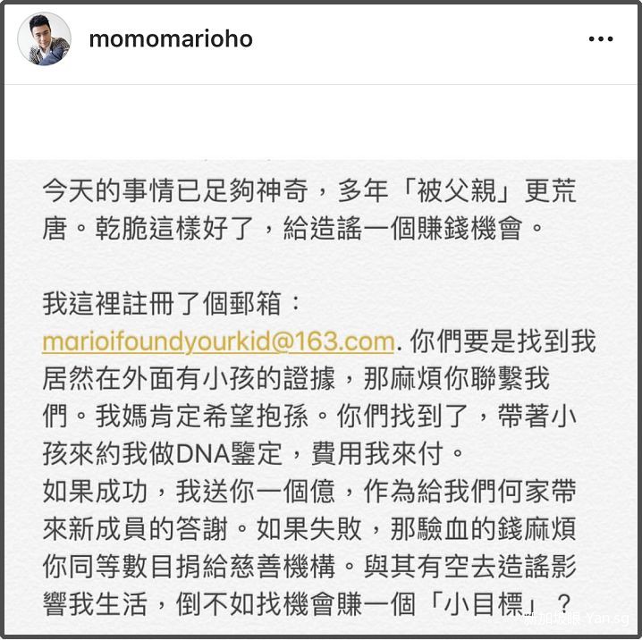 何猷君在自己的社交媒体上与造谣者正面刚,让造谣者带着他所谓的“儿子”来和他做亲子鉴定,要是是真的,他出价一个亿!