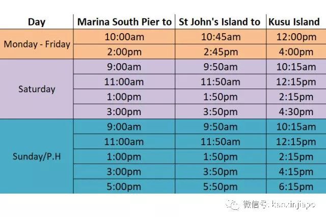 从新加坡去圣约翰岛和龟屿岛都从滨海南码头出发。根据官网信息,目前滨海南码头—圣约翰岛—龟屿岛—滨海南码头线路的成年票为18新币/人,儿童票12新币/人。