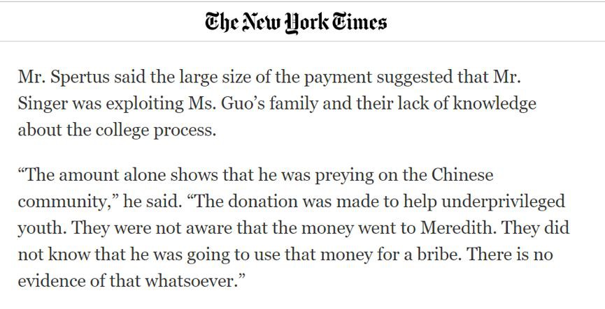 《纽约时报》报道称,很多中国家长并不知道美国申请流程,认为这是一笔对学校的正常渠道的捐助,并不知道中间人会违法伪造材料进行申请。