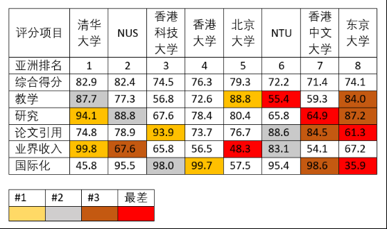 一、在教学上,“前八”当中,北大最强,清华老二,东大第三,NTU最弱。