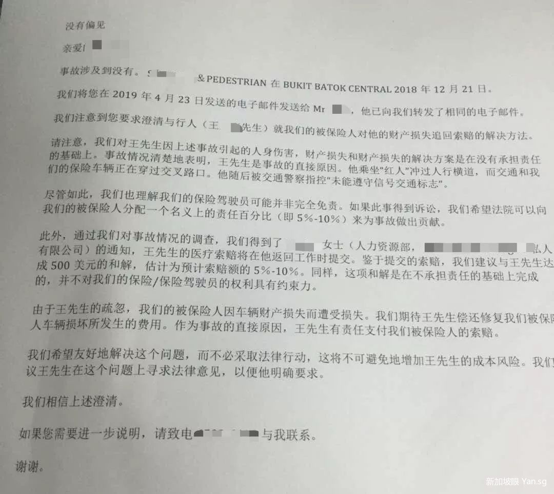 原本以为事情到这里就结束了,没想到这个月,王先生收到对方汽车保险公司寄来的信件,要求索赔修车费用,约为4200新币。