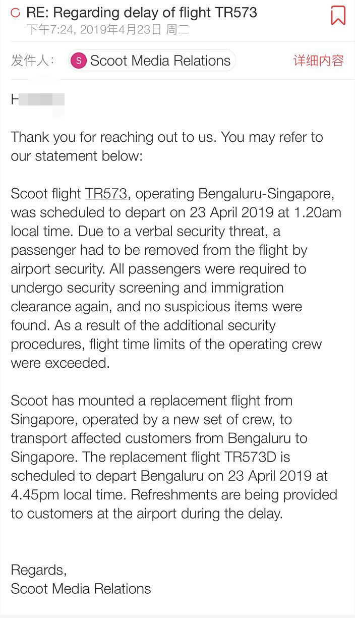 新加坡眼向酷航求证,酷航回复表示确有此事。