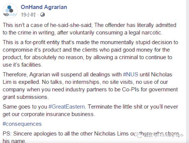事件持续升温,新加坡一间城市农场业公司——OnHand Agrarian,宣布暂停与NUS的所有项目,直到校方把这名男生开除。