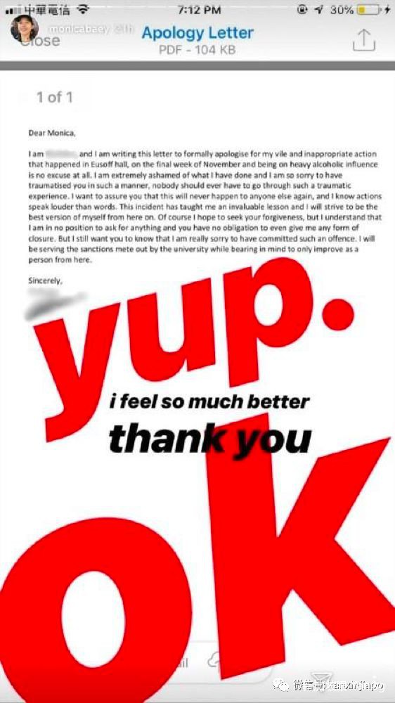 报警后,警方给了男生1年之内不得再犯的警告,NUS也对他处以了写道歉信、停学一个学期、接受强制辅导、不得再申请学校宿舍。