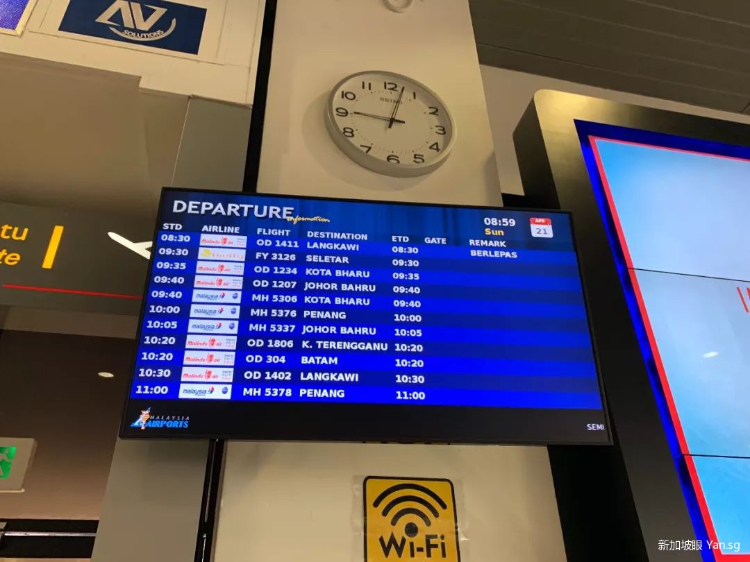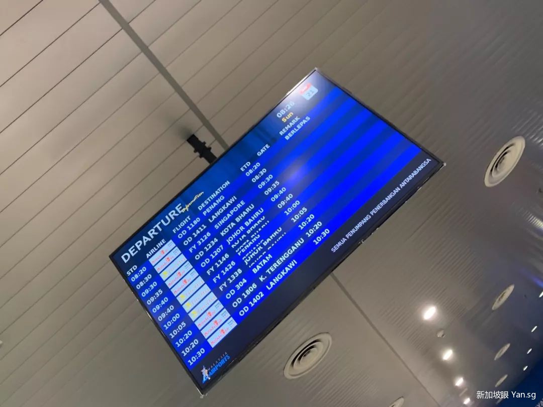 办完登机牌,步行五分钟即可到达国际出发厅,航班信息牌上刚开始显示的是Singapore,后来可能担心误会,又改成了Seletar。