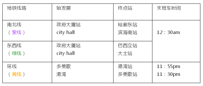 耶稣受难日当天(19日),地铁南北线(紫线)和东西线(绿线)最后一班车将于凌晨12:30从政府大厦地铁站(city hall)出站。