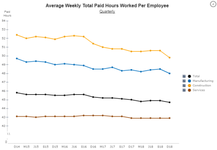 2014年第4季度-2018年第四季度 新加坡人均周工作时长新加坡相对完善的法律和较为严格的执行力,使得新加坡的上班族在一定程度上有选择加班与否的自由。但中国互联网行业从业者却因为经济寒冬的到来不敢轻易离职,激烈的竞争环境也使人不敢稍加松懈,工作模式从996走向9116,大家拼一个谁能在办公室耗更久,管它效率高低,管它乏味与否。